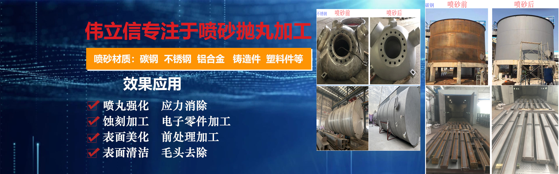 武漢偉立信機械設備有限公司(噴砂熱線:18186495283)是一家從事表面涂裝和表面清理設備的廠家,公司位于武漢市武昌區(qū)。是一家集表面涂裝和表面清理設備科研、開發(fā)、生產(chǎn)、銷售、服務于一體的綜合型企業(yè)。     公司自創(chuàng)建以來,一直秉持認真、負責的態(tài)度,以其科學而嚴密的管理,先進而不斷創(chuàng)新的技術,致力于表面處理設備的研制和開發(fā),主要產(chǎn)品有:手動噴砂機、自動噴砂機、開放式加壓噴砂機、干濕式噴砂機及大型噴砂房,拋丸機,除塵設備,另可根據(jù)客戶要求定做。低價經(jīng)營各類噴砂磨料:玻璃珠、鋼砂、鋼丸、不銹鋼丸、鋼絲切丸···